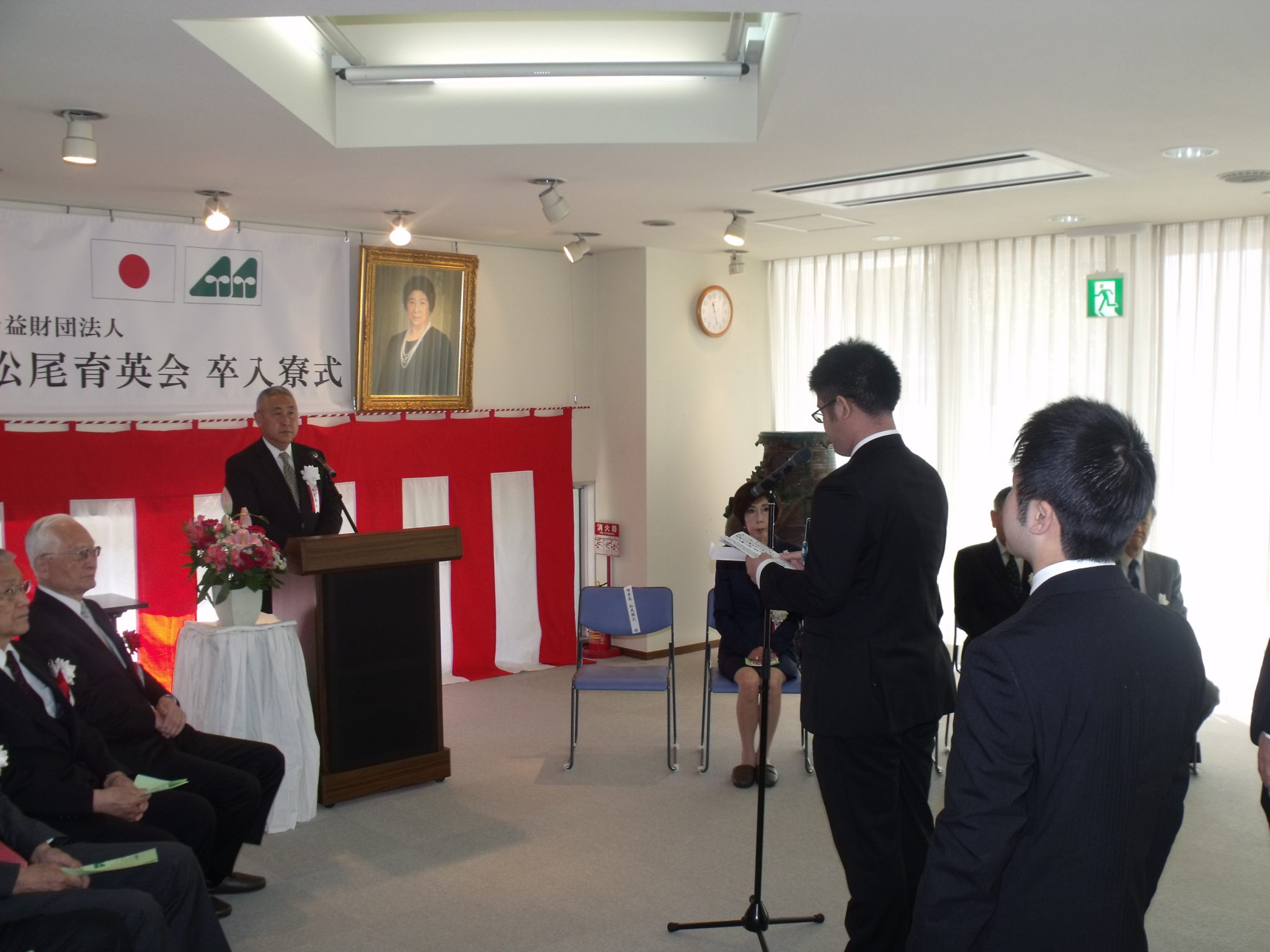 続きまして新入寮生の皆さん、入寮おめでとうございます。皆さんは厳しい競争を勝ち抜き、それぞれの希望とする大学に入学することができました。しかしながらそれは、ゴールではなく、この先皆さんたちの夢を実現するための、そしてさらに成長するための、新しいステージのスタートです。この寮には、勉強するために集中できる環境が整っています。また、年に数回ではありますけれども、普段松尾育英会の育英生でなければお話をうかがうことのできないような同窓会の先輩方と交流するチャンスもあります。皆さん方はこの環境を十分に活かし、4年後には自分たちの夢を実現するために少しでも成長してくれることを期待しています。最後になりましたが、大変お忙しい中、この学生たちのために本日出席してくださった同窓会の皆様に心より御礼を申し上げ、私のお祝いの言葉を終わらせていただきます。本日はおめでとうございました。